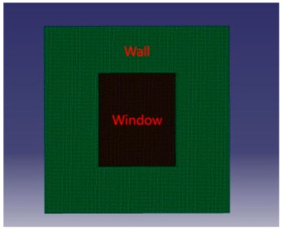 Utilizing the window and wall dimensions of the test site, a finite element model of the window-wall assembly components was developed, with acoustic parameters configured in accordance with the results presented in Section 3.2. The finite element model is illustrated in Figure 11. The parameters for the model are presented in Table 3.
