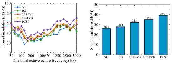 Sound insulation amounts for different window types. Note: SG, single-layer glass; DG, double-layer glass; 0.38 PVB, 0.38 PVB laminated glass; 0.76 PVB, 0.76 PVB laminated glass; DCSG, double-layer composite structure glass.