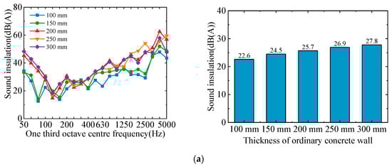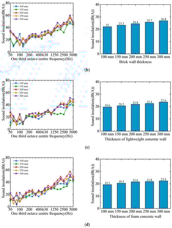 Figure 19a–d illustrates the simulation results of sound insulation under different wall materials with various wall thicknesses.