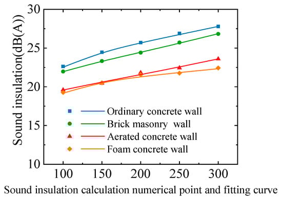 The results presented in Figure 19a–d are further fitted in plots, as shown in Figure 20, and the sound insulation capability R (unit in dB) of the four types of wall materials could be represented in terms of wall thickness t (unit in mm), as expressed in Equation (2).