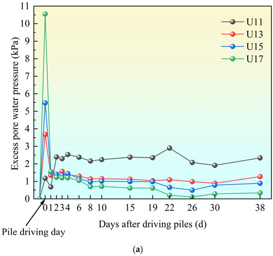 As can be seen from Figure 6, the pore water pressure shows a good linear relationship with depth in figure. 2.4 m below the ground surface is the junction of vegetative fill and pulverized clay, and the pulverized clay layer is completely below the water table because the groundwater level is maintained at about −0.74 m on the day of piling, so the initial pore water pressure of the pulverized clay layer increases linearly with the increase in the depth, which indicates that the excess pore water pressure induced by the soil squeezing effect on the day of piling also shows an approximately linear relationship. of excess pore water pressure on the day of piling is also approximately linear.