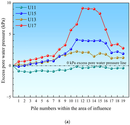 As shown in Figure 8, when drilling H-type piles No. 1~12, the pore water pressure measurement points U11~U17 and U21~U27 are increasing, among which, when drilling H-type piles No. 1~7, the excess pore water pressure value of each measurement point grows slowly, and the maximum excess pore water pressure value of pore water pressure measurement point U1 appears at measurement point U17, with the maximum value of 1.94 kPa, and the maximum excess pore water pressure value of pore water pressure measurement point U2 appears at measurement point U27, with the maximum value of 1.27 kPa. During the drilling of H-type piles No. 7~12, the excess pore water pressure value of each point increased rapidly, the maximum excess pore water pressure value of U1 appeared at point U17, and the maximum value of U1 was 9.35 kPa. The maximum value of pore water pressure at U2 is at U27, and the maximum value is 2.73 kPa. When piles 13~19 are driven in, the excess pore water pressure at each measurement point starts to decrease gradually and stabilize, which indicates that the response of pore water pressure is closely related to the distance of the pore water pressure measurement point from the construction pile.
