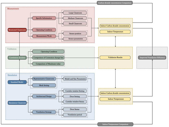 This study aimed to determine whether and to what extent indoor CO2 concentration exceeded standards in a teaching building in a cold region of China through simulation and measurement. First, three types of classrooms (large-, medium-, and small- sized) in a typical teaching building in Harbin were selected as the research subjects, and their indoor CO2 concentrations were monitored. Based on the measured data, the simulation model was validated, and the indoor air quality was analysed. Second, optimisation designs were proposed in three modes: window opening, entrance, and ventilation modes. The effectiveness of the design strategies in balancing indoor thermal comfort and air quality was verified. The research framework is illustrated in Figure 1.