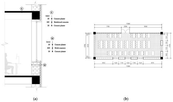 This study used Classroom 218, a medium-sized classroom located on the second floor of the building, which can accommodate up to 72 people, as an example to construct the standardized model. Figure 3 shows the specific details of the classroom selected as a simulation case. As can be seen from Figure 3a, in order to meet the requirements of insulation design in winter, the external walls of the teaching space in cold regions are thicker. Figure 3b shows the details of the layout of the classroom space, which is representative of the typical plan features of the climate zone.