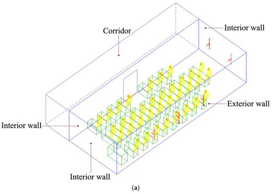 In the field of CFD, common simulation software includes ANSYS Fluent, Airpak, Butterfly, and so on [39]. In this study, Airpak software was used to simulate indoor CO2 distribution and predict indoor thermal comfort environment. The software is developed by Fluent and is widely used in simulation of indoor ventilation and air conditioning [40]. Figure 4a shows the details of the simulation model. Based on field surveys of teaching spaces in universities in cold regions of China, most classrooms have only one exterior wall, with the remaining three walls being interior walls. Therefore, while keeping the boundary condition parameters constant, this study designated one long side of the classroom as the exterior wall and the other three sides as interior walls. Windows were modelled on the exterior wall side, with the window opening method and window-to-wall ratio determined based on the measured classroom dimensions. An entrance was positioned in the middle of each interior wall. Four radiator models were placed below the window slit model, each with a constant power of 500 W. Based on the observed indoor occupancy, the model was set to accommodate 35 people, evenly distributed within the classroom. Table 4 presents specific parameters within the classroom module. The quantity in the table is set according to the actual situation of the classroom and the survey results. Personnel sitting size is calculated according to the average height of the investigators, the window seam combined with the survey classroom according to the field measurement and service life reasonable setting, table and chair and podium size according to the field measurement, and CO2 value is set when sitting human respiration emissions. During the measurement phase, all doors and windows of the classroom were closed. Therefore, in subsequent simulation adjustments, the study simulated the airflow under closed-door and window conditions by setting the gaps in the doors and windows. Additionally, the indoor airflow under open-door and window conditions is illustrated in Figure 4b.