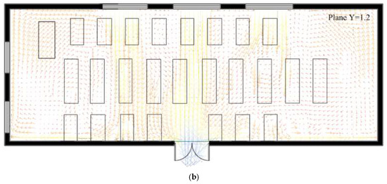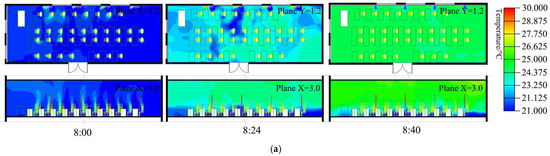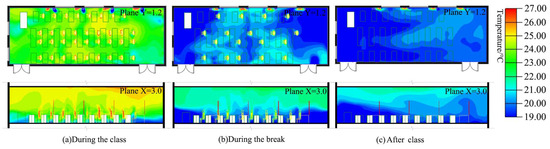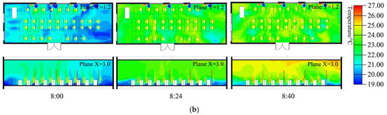 Figure 12a shows the simulation results for the indoor temperature field over time in Case 1.1. In the first 40 min of the class, the average indoor temperature increased from 21 °C to 25.1 °C, and the indoor temperature at the seated level of indoor occupants fluctuated between 24 °C and 26 °C. The average PMV was −0.0791, and the overall indoor thermal comfort was fair. As shown in Figure 12b, 40 min after the class began, the average indoor temperature was 24.2 °C and the overall indoor temperature was relatively low. In addition, compared with the cloud image for Case 1.1, the changes in indoor temperature in the middle area of the classroom and before and after the start of class were obvious. The PMV value was −0.32, and the level of indoor thermal comfort was generally low.
