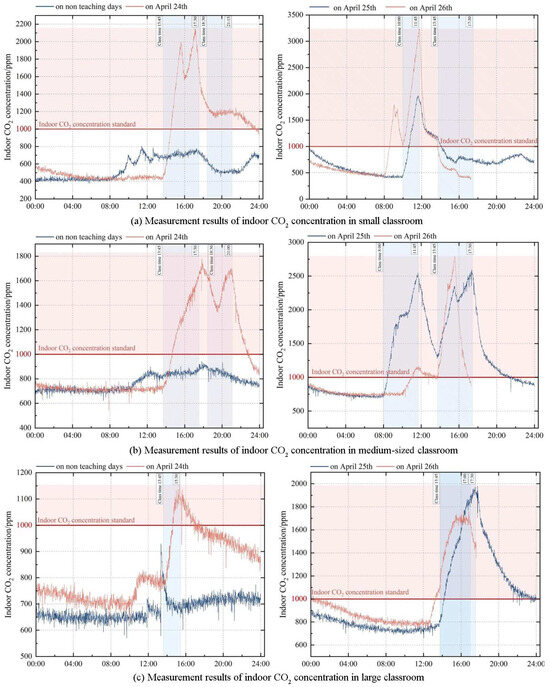 As shown in Figure 6, the CO2 concentration in all three classrooms, small-, medium-, and large-sized, majorly exceeded the standard during class times. The indoor CO2 concentration was lower than 1000 ppm on non-school days. During class, when the number of indoor occupants was higher, the CO2 concentration was significantly higher. As shown in Figure 6a, the rate of accumulation of indoor CO2 concentration in the small classroom during class was relatively high, and the peak value was large, with the maximum peak value approaching 3200 ppm. This may have been due to the small classroom space, the large number of indoor occupants during the class, and the lack of timely ventilation. In addition, as shown in Figure 6c, because CO2 accumulated indoors on April 25 and was not removed in a timely manner due to poor ventilation, the indoor CO2 concentration was still too high during the unoccupied period on April 26.