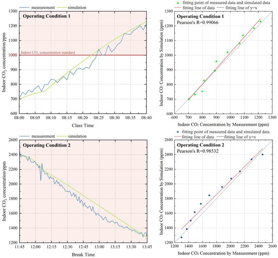 The study fitted the measured and simulated indoor CO2 concentration results during class and break periods in the medium-sized classroom separately to verify the accuracy of the simulation model. The accuracy of the model was estimated using Pearson’s correlation coefficient (Pearson’s R). Formula (1) represents the calculation formula for Pearson’s R. This value indicates the linear correlation between two variables, Tmeas and Tsim, ranging from −1 to 1. When the absolute value approaches 1, the simulation accuracy is higher. This value can be calculated using Formula (1), where Tmeas represents the measured data and Tsim represents the simulated data. To further validate the accuracy of the model, the boundary limits of the coefficient of variation of the (CV(RMSE)) were calculated, which provide insights into the extent of discrepancy between the simulated and measured data. The value can be calculated using Formula (2), where n represents the number of hours during the monitoring period, i represents each hour of the study period, and value of p is suggested to be 1. The acceptable ranges of the CV(RMSE) relative to the hourly calibration data were set at below 30%.