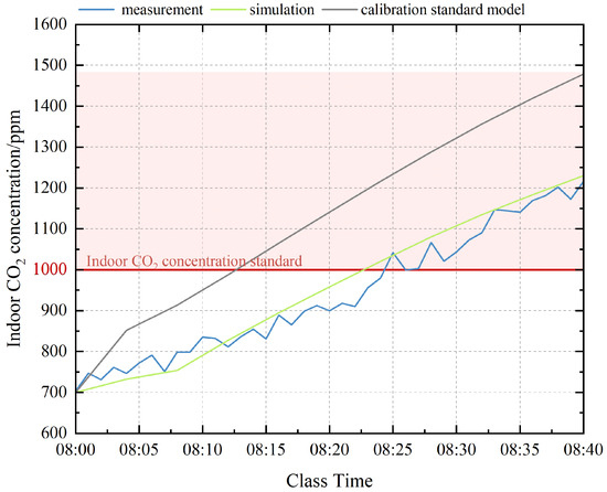 To enhance the reliability of the simulation model, Airpak software was used to simulate two scenarios in the medium-sized classroom: occupancy during class and break periods. The measured data were fitted with the simulated data, demonstrating a high level of model credibility. The Pearson’s R values for the two scenarios were 0.99066 and 0.98532, both exceeding 0.8. In addition, the study further verified by calculating CV(RMSE) values. It can be seen from the calculation results that the CV(RMSE) values of the two scenarios simulation models are 2.897% and 4.59%, respectively, and the simulation error is far lower than the specified threshold. In Figure 7, the curve of simulated CO2 concentration over time approximates a linear function graph. However, the slope of the growth rate of CO2 concentration in the measured data fluctuates significantly. These discrepancies arise from differences in the distribution and activities of teachers and students indoors compared with the simulation conditions. Additionally, variations in the rate of CO2 release by different individuals disturbed indoor airflow, leading to an unstable increase in indoor CO2 concentration.