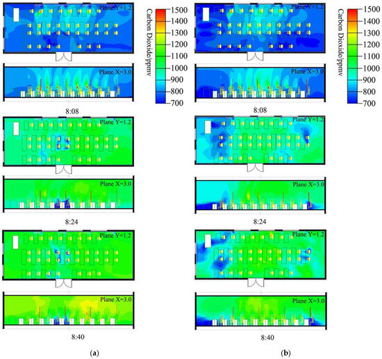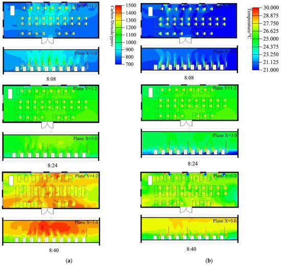 Figure 8 shows that the standardised model with single-side window ventilation exhibited an overall elevated level of indoor average CO2 concentration. Approximately 12 min after the start of class, the indoor CO2 value reached the upper limit (1000 ppm). Compared with actual classroom data, this ventilation mode resulted in a higher rate of accumulation of CO2, with the CO2 concentration peak rising from 1203 ppm to 1402 ppm (after 40 min of class). Figure 9 illustrates the distribution of CO2 concentration and temperature within the classroom during a 40 min class period. As seen in (a), the indoor CO2 concentration increased over time. At a height of Y = 1.2 m (typical breathing height while seated), CO2 rapidly accumulated in the space farthest from the window, with CO2 concentration reaching a peak of 1500 ppm after 40 min of class. The temperature distribution cloud map in (b) indicates that after 40 min, the temperature distribution in the horizontal space indoors became more uniform, with the temperature near Y = 1.2 m approaching 26 °C.
