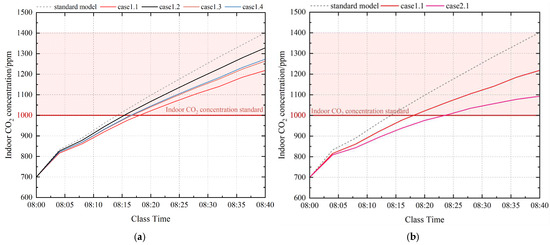 Standardised model of indoor average CO2 concentration change. (a) Case 1.1 (one entrance): simulation results for indoor CO2 concentration. (b) Case 2.1 (two entrances): simulation results for indoor CO2 concentration.