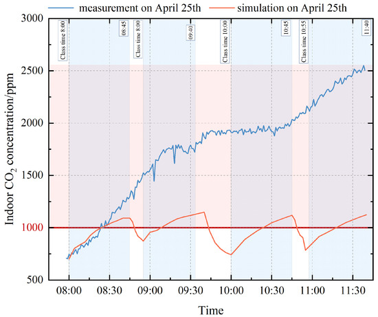 Comparison of the measured data and ventilation design strategy simulation results for the medium-sized classrooms on April 25th.