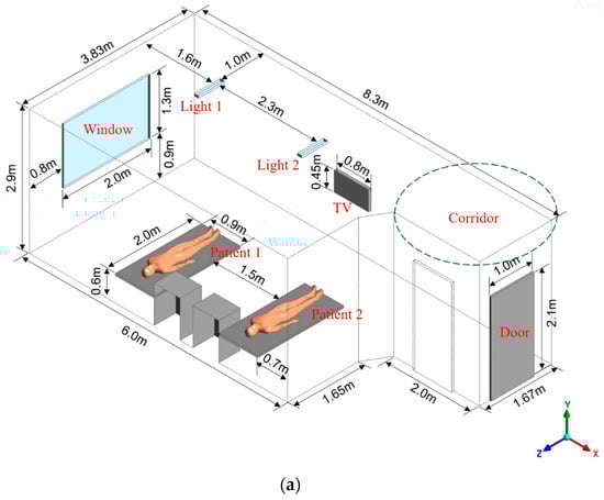 - Liu, Z.; Wang, L.; Rong, R.; Fu, S.; Cao, G.; Hao, C. Full-scale experimental and numerical study of bioaerosol characteristics against cross-infection in a two-bed hospital ward. Build. Environ. 2020, 186, 107373. [Google Scholar] [CrossRef] [PubMed]