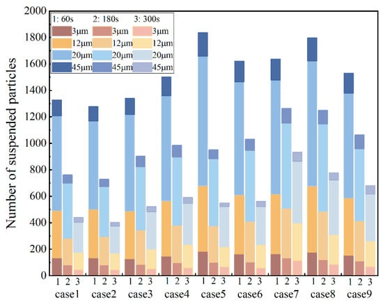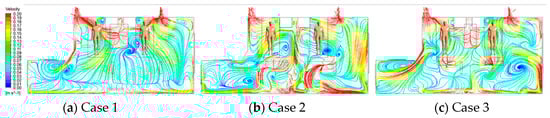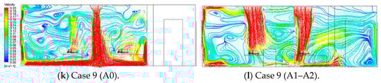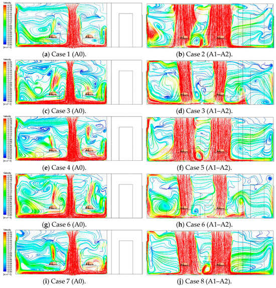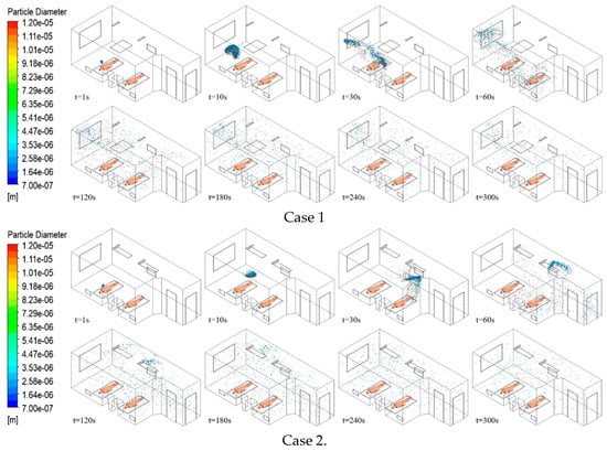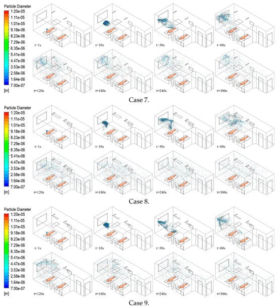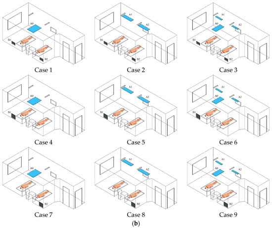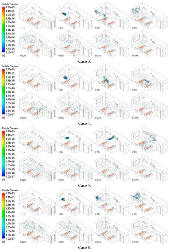 - Air supply diffuser and exhaust outlet layouts significantly influenced particle diffusion paths more than exhaust outlet size, establishing a directional airflow from the supply to the pollutant source, then to the exhaust outlet, optimizing aerosol entrainment and removal. In Case 7, air bypassed the pollutant release source (Patient 1), and a locking phenomenon occurred in the left area of the ward, causing high-concentration accumulation. Case 2 demonstrated the highest removal efficiency of 50.3%, but most particles migrated towards and accumulated above Patient 2. However, in Case 1, with 40.4%, second only to case 2, particles did not accumulate in Patient 2, offering the best layout for reducing cross-infection risk and contaminant removal.