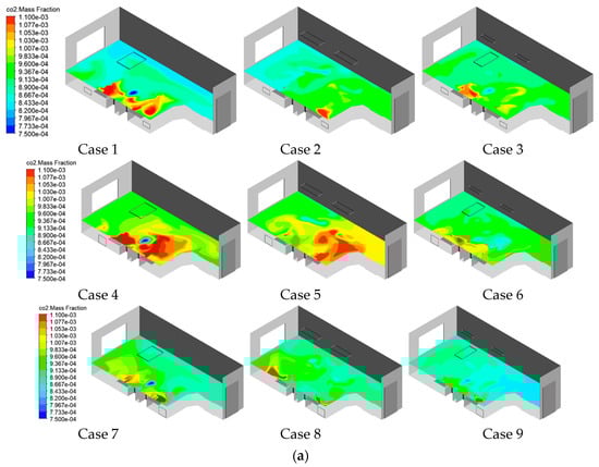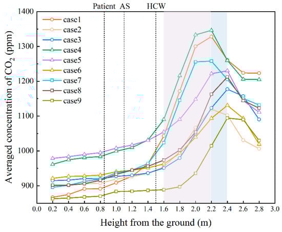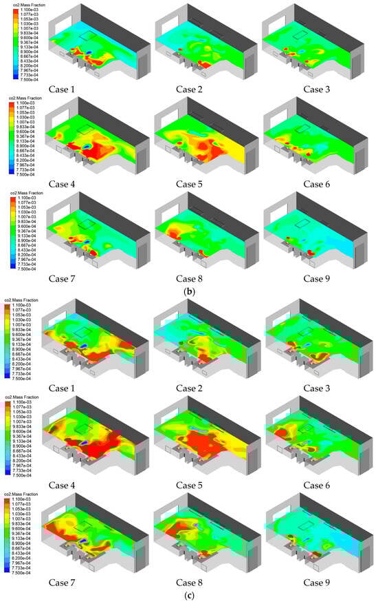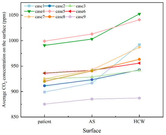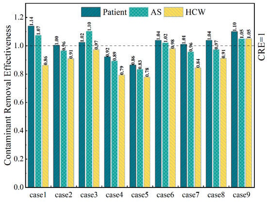 - Air supply diffuser and exhaust outlet arrangements affected CO2 dispersion in different respiratory planes. Dual-sided exhaust outlets facilitated pollutant removal. In addition, the right-side exhaust outlet facilitated pollutant removal more effectively than the left, due to the extensive space adjacent to B1, elongating the removal pathway and causing pollutant accumulation, elevating overall contamination. Positioning the air supply diffuser A0 near the pollutant source created an air curtain that hindered pollutant spread towards the opposite side. Three supply diffusers provided wider fresh air coverage, diluting pollutants. Case 9 efficiently removed contaminants with CRE values exceeding 1 at the patient, AS, and HCW respiratory planes: 1.10, 1.05, and 1.05, respectively.