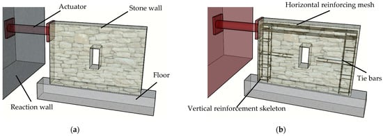 In order to enrich the variety of test walls, we designed two walls with identical opening sizes: one is an ordinary stone wall, and the other is a stone wall implanted with a steel reinforcement skeleton system. The construction practices for these walls refer to the literature [,,], which are consistent with the methods used in Xu’s tests []. The walls are designated as Y-1 and Y-2, as shown in Figure 2, and their specific parameters are detailed in Table 1.