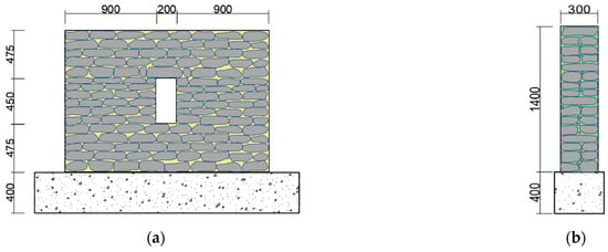 According to the actual survey, the wall of a typical residence in Li County was selected as the prototype. The wall was made of masonry with woolen stone and yellow mud, and the dimensions of the wall were 4000 mm (long) × 2800 mm (high) × 600 mm (thick). Considering that the adhesive property of the yellow mud was not good, and given the irregularity of the woolen stone and the difficulty of masonry construction, a reduced-scale model of “reduced scale of the wall length and the full scale of the blocks” [] was adopted for the indoor experimental study. The test stone wall designed in this paper adopts 1/2 of the actual wall size, i.e., the length × height × thickness is 2000 mm × 1400 mm × 300 mm, and the test window opening is rectangular in shape, located in the center of the wall, with a size of 200 mm × 450 mm. The masonry materials are yellow mud, slate, rebar, and cement mortar. The test materials used in this paper are all from Li County of Aba Tibetan and Qiang Autonomous Prefecture, where the Tibetan and Qiang dwellings were originally concentrated, and the test walls were completed by the same group of workers.