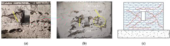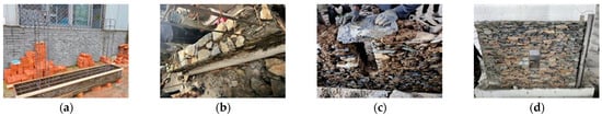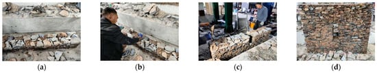 The stone selected for the test wall was hard, with no cracks or weathering; the yellow mud was sieved before mixing; the moisture content was controlled between 30% and 40% during mixing; and the wall was constructed in strict accordance with the masonry requirements of the stone masonry project in the Chinese “Code for construction of masonry structures engineering” []. We ensured that the yellow mud between the upper and lower adjacent stones was dense and the thickness of the mortar joints did not exceed 12 mm. The larger gaps between the stones were filled with mud after filling the small stones, and the stones and mud were tapped tightly with a small hammer. The height of masonry was not more than 1.2 m per day. The process of Y-1 wall masonry is shown in Figure 4.