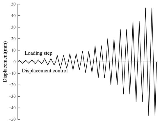 Horizontal loading is shown in Figure 6; the low weekly repeated loading scheme is adopted and the horizontal load is applied by displacement control. The displacement amplitude is determined by projecting the interlayer displacement angle. According to the calculation, the loading displacement amplitude is 1.4 mm, 1.75 mm, 2.8 mm, 5.6 mm, 7.0 mm, 9.3 mm, 14.0 mm, 20.0 mm, 28.0 mm, 35.0 mm, and 46.7 mm, and the displacement loading at all levels is cyclic twice; each level of load is applied and held for 1 min, and the loading rate is kept at 0.2 kN/s. When the strength of the wall decreased significantly or the wall displacement was large, the loading was stopped.