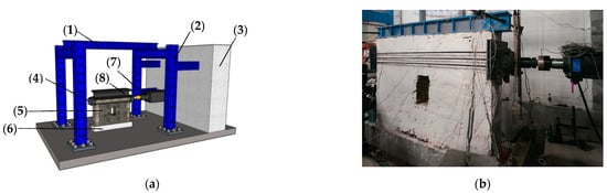 (a) Schematic diagram of test loading system: (1) gantry longitudinal beam; (2) portal frame pillar; (3) reaction wall; (4) loaded brazier and steel plate; (5) stone wall; (6) floor beam; (7) actuator; (8) vertical stacking; (b) wall test diagram.