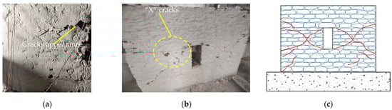 In Sichuan, the Tibetan and Qiang peoples have traditionally lived in high mountains or canyons with few resources. In their struggle against nature, the Tibetan and Qiang people created a distinctive national style of stone and wood architecture [], which is highly valuable for inheritance and preservation, by using natural resources like irregular, flaked stone blocks and yellow mud as the primary building materials. Figure 1 depicts traditional Tibetan and Qiang dwellings. Tibetan and Qiang dwellings show a unique architectural culture, but because it does not give full consideration to the seismic performance of the structures, which are located in an earthquake-prone area, this kind of ancient architectural culture is very vulnerable to damage. Window openings are one of the main vulnerable areas in these houses under the action of earthquakes, and they have a great impact on the seismic performance of the building, but the damage mechanism of window openings on the buildings is still unclear, and the relationship between the size, shape, and aspect ratio of the openings and the seismic capacity of the wall has yet to be researched.