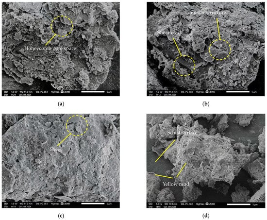 The macroscopic physical and mechanical properties of soil and stone and their specific engineering properties are mostly determined by their microstructures in addition to their mineral composition factors; therefore, it is of great scientific significance to explore the microstructure of yellow mud and schist for assessing the stone walls of Tibetan and Qiang dwellings. The scanning electron microscope (SEM) is one of the most common and important research tools in the study of observing the microstructure of an object [], and it is able to directly reflect the surface properties and three-dimensional morphology of particles as well as the details of the microstructure. The microscopic scanning images of each specimen (all at 5000×) are shown in Figure 10.