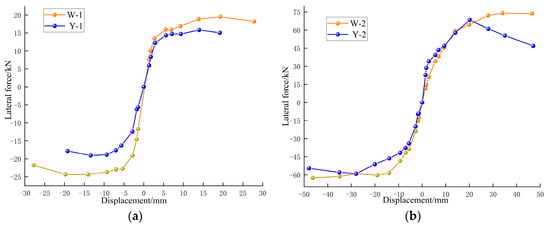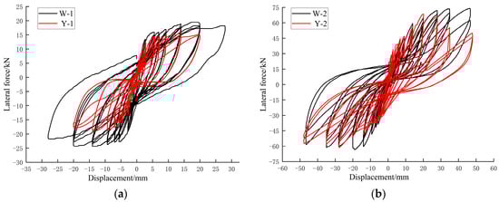 (a) Comparison of hysteresis curves of the Y-1 wall and W-1 wall; (b) comparison of hysteresis curves of the Y-2 wall and W-2 wall.