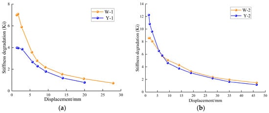 (a) Comparison of the stiffness degradation curves of the Y-1 wall and the W-1 wall; (b) comparison of the stiffness degradation curves of the Y-2 wall and the W-2 wall.