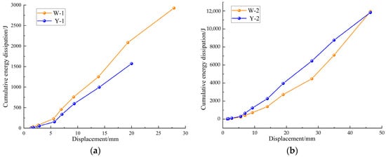 (a) Comparison of cumulative energy dissipation for the Y-1 and W-1 walls; (b) comparison of cumulative energy dissipation for the Y-2 and W-2 walls.