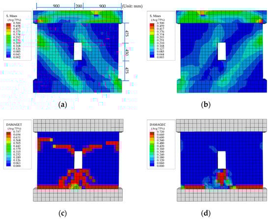 - From the stress diagrams, it is evident that the wall is subjected to vertical loads and horizontal reciprocating forces, resulting in diagonal stresses that extend at approximately a 45° angle from the window opening’s diagonal corners to the top left and bottom right, and from the top-right and bottom-left corners of the window opening. The concentration of stress at the diagonals of the specimen indicates a dense distribution of cracks and severe damage, which is consistent with the observed “X”-shaped crack pattern on either side of the window opening in the experimental wall. Figure 15c,d depict the final tensile and compressive damage outcomes for the modeled walls, with damage values scaled from 0 to 1, where 0 represents undamaged and 1 signifies fully damaged. The figures clearly demonstrate that the tensile damage in the wall is characterized by the formation of a prominent “X”-shaped crack pattern, emanating from the corners of the wall and centered around the opening. In contrast, the compressive damage is primarily concentrated at the base of the wall.