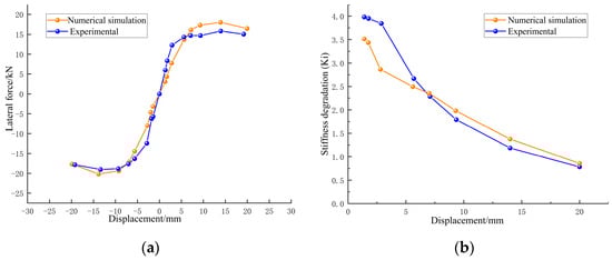 (a) Comparison of the skeleton curves between the Y-1 wall test and the simulation; (b) comparison of the stiffness degradation curves between the Y-1 wall test and the simulation.