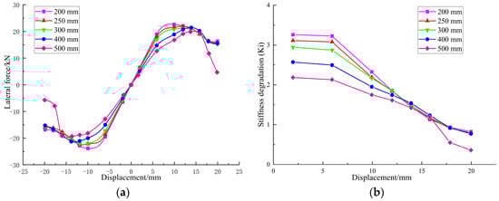 where Ki is the cut-line stiffness of the load–displacement curve at the ith level of cyclic loading; +Fi, −Fi are the load values at the positive and negative peak points of the first cyclic loading; +Xi, −Xi are the displacement values at the positive and negative peak points of the first cyclic loading. The relationship between the cut line stiffness and displacement of each specimen from Equation (1) is shown in Figure 13. By comparing and analyzing Figure 13, it can be obtained that:
