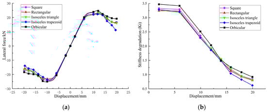 (a) Skeleton curves; (b) stiffness degradation curves.