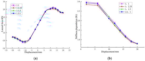 To investigate the impact of the height-to-width ratio of window openings on the seismic performance of stone walls, we designed four distinct openings with ratios of 1:1, 1:1.5, 1.5:1, and 1:2.25, all based on a 300 mm by 300 mm template. Subsequently, finite element models were constructed for each to facilitate analysis. Figure 19 illustrates the skeleton curves and stiffness degradation curves for each wall configuration under the specified static forces. Observations from Figure 19 reveal that the trend in the skeleton curve and stiffness degradation curve is largely consistent across all wall types. The opening with a height-to-width ratio of 1:1 demonstrated the optimal bearing capacity and stiffness, whereas the 1:2.25 ratio performed the poorest. However, the performance difference between the best and worst ratios was not significantly large. Consequently, the opening with a height-to-width ratio of 1:1 emerged as the most favorable design among the varying ratios. Collectively, the height-to-width ratio of the openings exerted a relatively minor influence on the seismic performance of the stone walls.