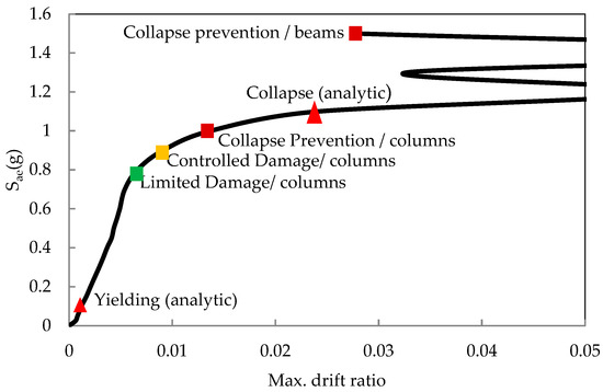 - There is a reasonable margin between the probability of reaching a collapse state and that of the Collapse Prevention Performance Level under the effect of a Maximum Earthquake. The global and local damage criteria give consistent results at this performance level.