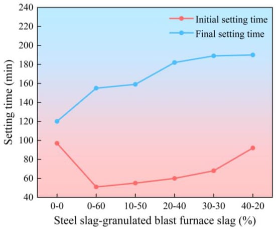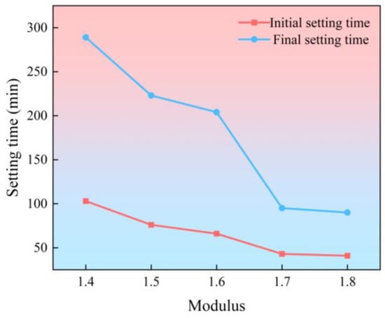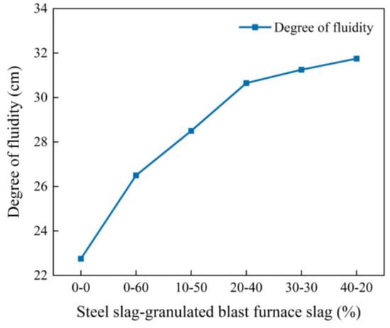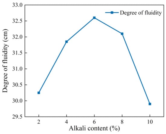 - Different SS dosage, alkali content, and modulus of exciter were found to have significant effects on the properties of SS/GBFS–cement-based grouting materials through one-way tests. The slurry flow and setting time increased with the increase in the SS dosage; meanwhile, the flow increased with the increase in the activator modulus, and the setting time decreased. In addition, the slurry fluidity showed a tendency of increasing and then decreasing with the increase in the alkali content, and the fluidity reached 32.6 cm at 6% alkali content, and the setting time gradually decreased with the increase in the alkali content.