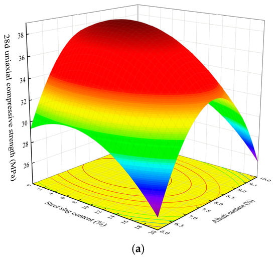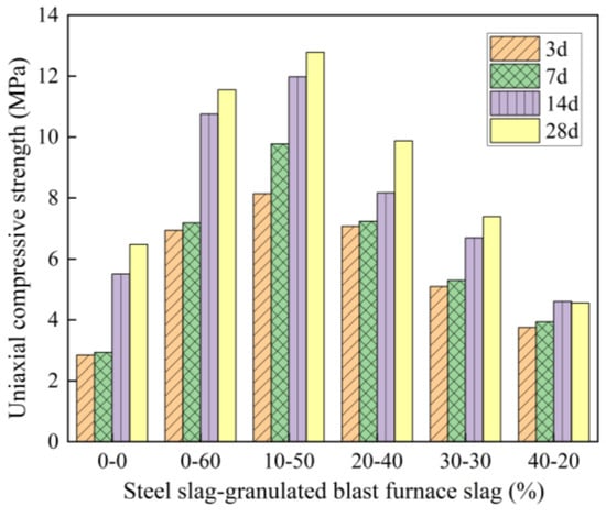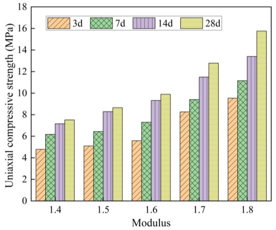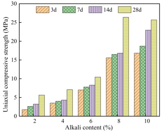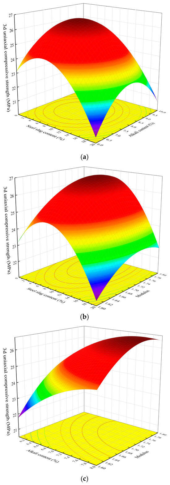 - The uniaxial compressive strength of the slurry exhibited a pattern of initial increase followed by a decline with the progression of SS doping, peaking at a doping level of 10%. Concurrently, as the alkali content and the modulus of the exciter increased, the compressive strength generally ascended. Specifically, the 28-day uniaxial compressive strength achieved a high of 26.38 MPa at an alkali content of 8%. However, beyond this threshold, the 28-day strength of the slurry began to diminish.