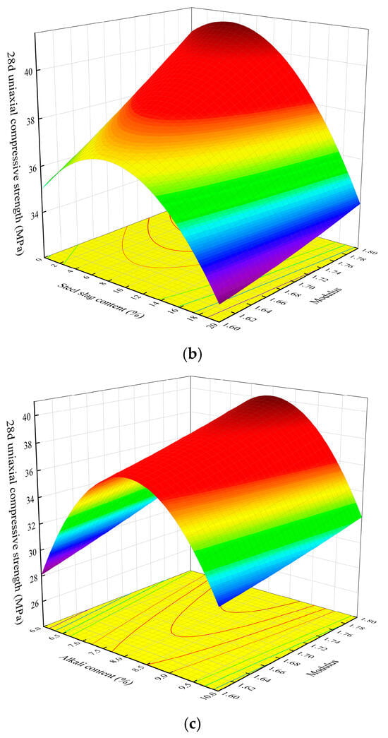 - Utilizing the response surface methodology, a quadratic polynomial regression model was meticulously crafted with the 3-day and 28-day uniaxial compressive strengths as the key response variables. The 3-day strength of the slurry stone exhibited a pronounced interactive effect with both the alkali content and the modulus of the activator. Similarly, the 28-day strength showed a significant interaction with the addition of SS and the modulus of the activator. The regression models boasted R2 coefficients exceeding 0.95, indicating a high degree of model accuracy and excellent fit. Upon thorough evaluation, the optimal mix proportions were identified as a SS dosage of 7.07%, an alkali content of 7.82%, and an activator modulus of 1.8. These proportions yielded a 3-day and 28-day uniaxial compressive strength of 26.54 MPa and 41.56 MPa for the slurry stone body, respectively. Additionally, the mixture demonstrated a flowability of 33.70 cm, with initial and final setting times of 24 min and 39 min, respectively, culminating in an optimal overall performance.
