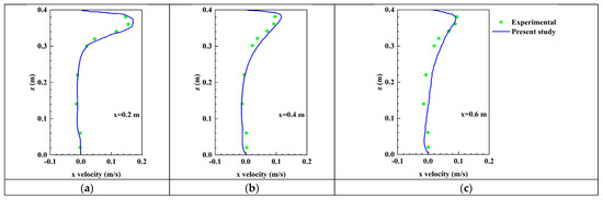 To accurately simulate the flows, the experimentally measured data of Chen et al. [19] was employed for the present research to validate the airflow field. Figure 2 displays the comparison of the velocities at three different positions x (x = 0.2 m, x = 0.4 m, and x = 0.6 m) in the y = 0.2 m plane. As can be observed from Figure 2, it can be found that the simulated data within this research are basically identical to the results of previous studies [19], which proves the accuracy and reliability of the established model.