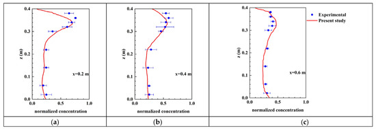 Comparison of normalized particle concentration with experimental data [19] at three distinct positions on the plane y = 0.2 m. (a) x = 0.2 m; (b) x = 0.4 m; (c) x = 0.6 m.