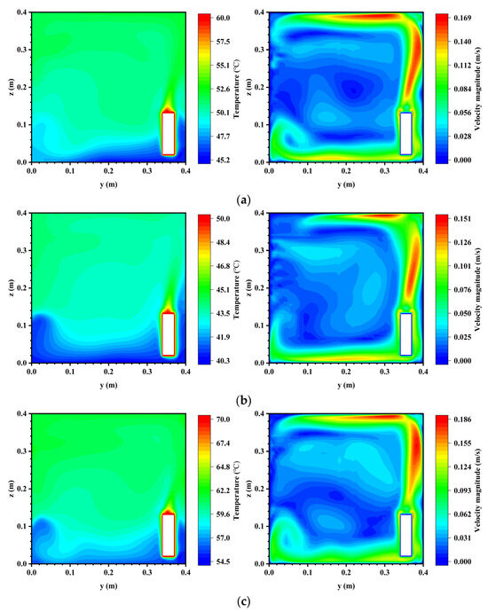 Temperature fields and airflow fields in a plane at x = 0.4 m. (a) Case III; (b) Case IV; (c) Case V.