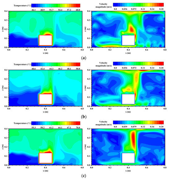 Temperature fields and airflow fields in the plane y = 0.355 m. (a) Case III; (b) Case IV; (c) Case V.