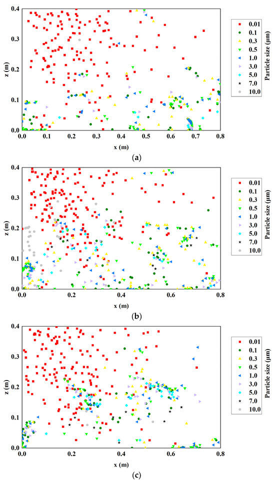 The temperature of the heat source exercises a substantial influence on the temperature and airflow fields, which in turn affects the distribution of particle deposition. Figure 6 presents scatter plots of particle deposition onto the back wall for various particle sizes under Cases IV, III, and V. Figure 6a displays that 0.01 μm particles are most distributed on the back wall and have the widest distribution region, which is distributed throughout the entire back wall region, with the most concentrated being the upper-left region of the back wall. The cause of this is that the release location of the particles is at an upper-left corner of the chamber, and particles of 0.01 μm are very distinctly subjected to thermophoretic forces. Upon release, they are carried upward by the thermal plume created by the heat source and deposited predominantly on the upper-left corner of the back wall. Additionally, since the direction of the velocity of the incoming air is set to be rightward, some 0.01 μm particles will be carried to the right side by the rightward airflow, and that makes the 0.01 μm particles spread out over the whole back wall region. From Figure 6a, it is observed that particles ranging from 0.5 to 10.0 μm are primarily distributed between the z = 0 and 0.1 m regions, with a denser distribution at the lower-right region of the back wall. This stems from the particles being influenced by gravity, moving downward, and by the incoming airflow, moving to the right. Consequently, these particles are mainly deposited in regions below z = 0.1 m and densely distributed in the lower-right position of the back wall. Additionally, Figure 6a reveals that the particle distribution in the upper-right corner of the back wall is sparse. This is due to the upper-right corner being far away from the inlet, where smaller particles are mainly affected by the thermophoretic forces and have been basically deposited before reaching this region. Meanwhile, larger particles are influenced by gravity and predominantly deposited to the lower region of the back wall, which leads to a reduced particle distribution at the upper-right area of the back wall.