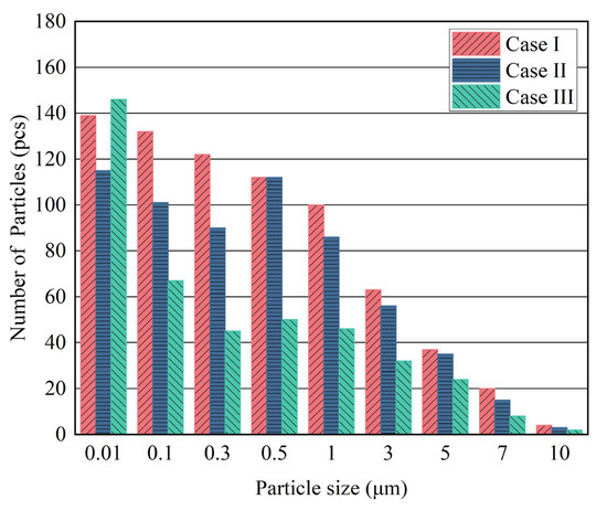 To investigate the influence that the distance from the heat source to the back wall has on the distribution of particle deposition on the back wall, it is of great importance to examine the sedimentation of particles of various sizes on the back wall. Figure 7 illustrates the number of particles of a different size deposited onto the back wall for Cases I, II, and III. As shown in Figure 7, with regard to the particles whose size ranges from 1.0 to 10.0 μm, the amount of particle deposition diminishes as the distance from the heat source to the back wall increases, and the tendencies are similar. When the particle size is 0.01–0.5 μm, the number of particles deposited fluctuates slightly as the distance from the heat source to the back wall varies, but generally speaking, the quantity of particles deposited decreases with increasing distance from the heat source to the back wall. The reason is that as the distance from the near-wall heat source to the back wall increases, the velocity of the airflow above the heat source decays faster. A faster decay of the airflow velocity results in a reduction of the velocity gradient in the region near the back wall, which in turn reduces the turbulence of the air, ultimately causing a reduction of the quantity of particles deposited on the back wall. Figure 7 reveals that when the distance from the heat source to the back wall rises from 20 mm to 30 mm, the situation of particle sedimentation on the back wall is more obvious than when the distance rises from 10 mm to 20 mm. This may be attributed to a more significant reduction in air velocity and turbulence intensity in the region near the back wall when the distance between the heat source and the back wall is increased from 20 mm to 30 mm compared to an increase from 10 mm to 20 mm. Furthermore, Figure 7 demonstrates that particles with sizes greater than 5.0 μm in diameter have minimal deposition on the back wall. Notably, for particles of 10.0 μm, deposition is negligible, and variations in the distance from the heat source bring about a scant impact on the deposition quantity. This is because for particles larger than 5.0 μm, gravity deposition plays a dominant role and particles are more prone to deposition on the floor of the chamber, which results in a decrease in the quantity of particles deposited on the back wall.