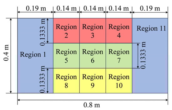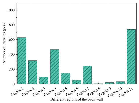 To facilitate a detailed analysis of particle deposition patterns on the back wall, it was divided into eleven distinct regions. This enables a detailed examination of deposition variations within these specific regions. For a clearer presentation of the regional division, in Figure 8, we added colors to the various different regions of the back wall, thereby making the regional division easier to observe. The delineation of these regions is depicted in Figure 8.