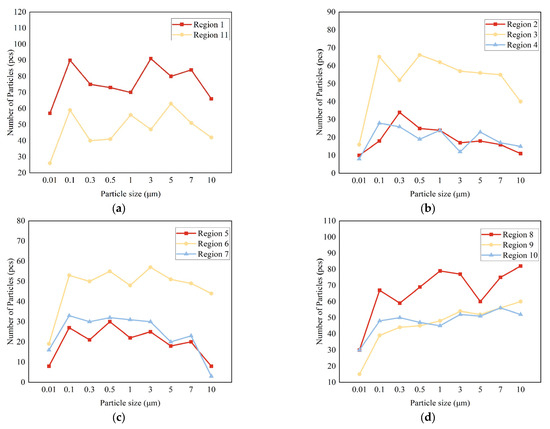 Number of particles deposited in different regions of the back wall for different particle sizes in Case IV. (a) Region 1 and Region 11; (b) Regions 2–4; (c) Regions 5–7; (d) Regions 8–10.