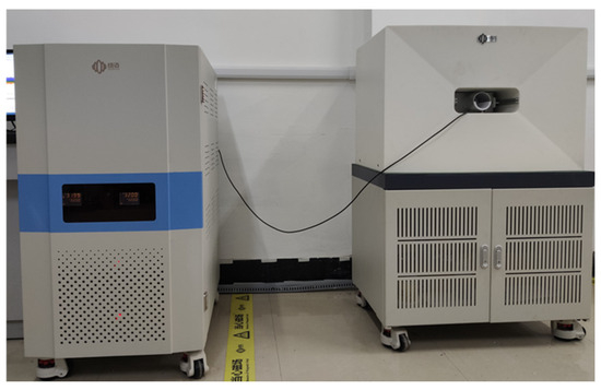 The microstructure was analyzed by scanning electron microscopy (SEM) using a Quanta 250FEG scanning electron microscope (FEI Company, Hillsboro, OR, USA). The pore structure was determined by a low-field nuclear magnetic resonance analyzer (Newmai Company, Suzhou, China; Figure 1). To meet the requirements of the NMR equipment, three R 50 mm × 60 mm cylindrical specimens were prepared in each group. NMR measurements were carried out on each group of specimens to measure the T2 relaxation value and porosity of the samples. The T2 relaxation value can be expressed as in Equation (1):