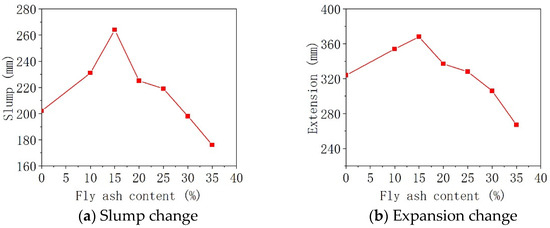 When the FA content was lower than 15%, the liquidity of the high-performance concrete increased with an increase in the content of FA. The reason is that FA has a ball effect—FA contains a large number of compact and smooth glass beads. The incorporation of FA into HPC can reduce the friction between the aggregate and mortar, so that the newly mixed FA concrete has better plasticity and cohesion than ordinary concrete [29]. When the content of FA was higher than 15%, the fluidity of the HPC began to decrease; the fluidity of the HPC with 20% and 25% content dropped slightly, while it remained the same as the control group. However, when the content of FA in the concrete was higher than 25%, because the density of FA is lower than that of cement, the volume of FA was about 1.3 times the volume of cement under the same quality. Therefore, when the FA content was too large, the volume of the slurry increased significantly. A large amount of slurry fills in the gaps in the aggregate and is wrapped on the surface of the quartz sand, thickening the lubrication film and reducing the viscosity of the mixture, thus reducing the fluidity of HPC.