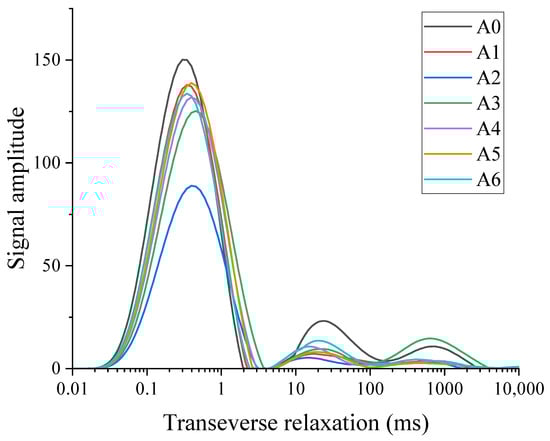 It can be seen that the first peak value of group A0 is relatively small, while the third peak exhibits the largest value. The reason is that the internal pore size of the control group without FA is mostly large, and there is more saturated water in these large pores, resulting in a longer relaxation time. The first and second peaks of groups A3, A4 and A5 are similar, and the pore water content in the concrete is smaller, so the signal is also weaker. This shows that adding FA can render the concrete denser and reduce the distribution of tiny pores [33]. The amount of FA in group A2 is 15%, and its signal amplitude is the smallest, indicating that 15% FA will significantly reduce the pores in the HPC. With the increase in the FA content, the first peak of the curve increases, and the internal pores increase. From the third peak of each curve, it can be seen that, when the FA content is 35%, the three peaks of group A6 are much larger than those of the other groups. The signal is the largest at each relaxation time, and the internal water content is significantly greater than that in the other groups.