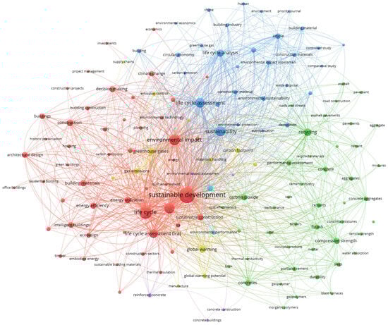 Numerous research investigations have explored sustainability in construction, sustainable construction materials, frameworks for selection, and tools to assess sustainability during construction activities [18]. A bibliometric analysis was conducted to explore the prior research efforts in the realm of sustainable construction materials. Over 3000 research studies, sourced from the Scopus database, were scrutinized. The analysis utilized prevalent keywords from research papers on sustainable construction material assessment over the past decade. These keywords were automatically categorized into clusters using VOSviewer, with each cluster being labeled according to its most representative terms. Studies within each identified cluster often show greater similarity to one another than to those in other clusters. Four distinct clusters were highlighted in different colors, with each revealing the underlying semantic themes within the textual data and showcasing emerging research patterns [19]. Cluster #1 concentrated on sustainable development, environmental impact, energy utilization, and sustainable construction. Cluster #2 addressed sustainability, life cycle assessment, and life cycle analysis. Cluster #3 focused on recycling, carbon dioxide, and performance assessment. Cluster #4 examined global warming, GHG, and carbon footprint. Figure 1 visually represents the key research themes and their interrelationships.